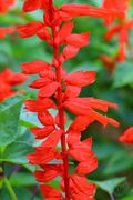 亚灌木状草本,高可达90厘米。茎钝四稜形,具浅槽,无毛。叶卵圆形或三角状卵圆形,长2.5-7厘米,宽2-4.5厘米,先端渐尖,基部截形或圆形,稀钝,边缘具锯齿,上面绿色,下面较淡,两面无毛,下面具腺点;茎生叶叶柄长3-4.5厘米,无毛。轮伞花序2-6花,组成顶生总状花序,花序长达20厘米或以上;苞片卵圆形,红色,大,在花开前包裹着花蕾,先端尾状渐尖;花梗长4-7毫米,密被染红的具腺柔毛,花序轴被微柔毛。花萼钟形,红色,开花时长约1.6厘米,花后增大达2厘米,外面沿脉上被染红的具腺柔毛,内面在上半部被微硬伏毛,二唇形,唇裂达花萼长1/3,上唇三角状卵圆形,长5-6毫米,宽10毫米,先端具小尖头,下唇比上唇略长,深2裂,裂片三角形,先端渐尖。花冠红色,长4-4.2厘米,外被微柔毛,内面无毛,冠筒筒状,直伸,在喉部略增大,冠檐二唇形,上唇直伸,略内弯,长圆形,长8-9毫米,宽约4毫米,先端微缺,下唇比上唇短,3裂,中裂片半圆形,侧裂片长卵圆形,比中裂片长。能育雄蕊2,近外伸,花丝长约5毫米,药隔长约1.3厘米,近伸直,上下臂近等长,上臂药室发育,下臂药室不育,下臂粗大,不联合。退化雄蕊短小。花柱与花冠近相等,先端不相等2裂,前裂片较长。花盘等大。小坚果椭圆形,长约3.5毫米,暗褐色,顶端具不规则极少数的绉折突起,边缘或稜具狭翅,光滑。花期3-10月。