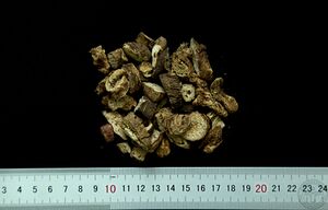 - 饮片:呈圆形、类圆形或不规则形厚片。外表皮黄白色或淡棕黄色,切面黄白色,有不规则裂隙气微,味微甘。