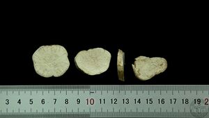 - 饮片:呈类圆形、半圆形或不规则的厚片。外表皮黄白色或淡棕黄色。切面可见黄色木质部小孔,略呈放射状排列。气微,味微苦。