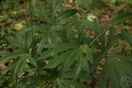 多年生草本。几根状茎短,横走,具多数须根,茎直立,高70-120厘米,下部直径2.5-6毫米,紫褐色,无毛,具纵肋,不分枝。叶通常2,疏生;下部叶具长柄;叶片盾状圆形,直径20-30厘米,掌状深裂;裂片7-9,每裂片再次2-3浅裂;小裂片宽4-8毫米,线状披针形,边缘具不等长的锐齿,顶端渐尖,初时反折呈闭伞状,被密蛛丝状绒毛,后开展成伞状,变无毛,上面淡绿色,下面灰色;叶柄长10-16厘米,无翅,无毛,基部抱茎;中部叶较小,直径12-24厘米;裂片通常4-5;叶柄长2-6 厘米。其余的叶呈苞片状,披针形,向上渐小,无柄或具短柄。头状花序多数,在茎端密集成复伞房状,干时宽6-7毫米;花序梗长5-16毫米,具数枚线形小苞片;总苞筒状,长9-12毫米,宽5-7毫米,基部有3-4小苞片;总苞片1层,5,长圆形,顶端钝,边缘膜质,外面无毛。小花8-10,花冠淡粉白色,长10毫米,管部窄,长3.5-4毫米,檐部窄钟状,5裂;花药变紫色,基部短箭形;花柱分枝伸长,扁,顶端钝,被笔状微毛。瘦果圆柱形,长5-6毫米,无毛,具肋;冠毛污白色或变红色,糙毛状,长8-10毫米。花期6-7月,果期8-10月。