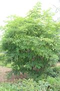 落叶灌木或小乔木,高5-6米;老枝淡红褐色,具明显的长椭圆形皮孔,髓部淡褐色。羽状复叶有小叶2-3对,有时仅1对或多达5对,侧生小叶片卵圆形、狭椭圆形至倒矩圆状披针形,长5-15厘米,宽1.2-7厘米,顶端尖、渐尖至尾尖,边缘具不整齐锯齿,有时基部或中部以下具1至数枚腺齿,基部楔形或圆形,有时心形,两侧不对称,最下一对小叶有时具长0.5厘米的柄,顶生小叶卵形或倒卵形,顶端渐尖或尾尖,基部楔形,具长约2厘米的柄,初时小叶上面及中脉被稀疏短柔毛,后光滑无毛,叶搓揉后有臭气;托叶狭带形,或退化成带蓝色的突起。花与叶同出,圆锥形聚伞花序顶生,长5-11厘米,宽4-14厘米,具总花梗,花序分枝多成直角开展,有时被稀疏短柔毛,随即光滑无毛;花小而密;萼筒杯状,长约1毫米,萼齿三角状披针形,稍短于萼筒;花冠蕾时带粉红色,开后白色或淡黄色,筒短,裂片矩圆形或长卵圆形,长约2毫米;雄蕊与花冠裂片等长,开展,花丝基部稍肥大,花药黄色;子房3室,花柱短,柱头3裂。果实红色,极少蓝紫黑色,卵圆形或近圆形,直径3-5毫米;分核2-3枚,卵圆形至椭圆形,长2.5-3.5毫米,略有皱纹。花期一般4-5月,果熟期9-10月。