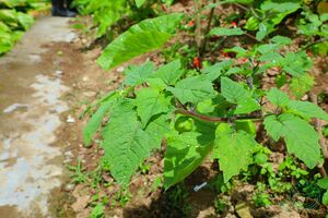 一年生草本;茎生柔毛,常多分枝,分枝毛较密。叶阔卵形,长3-8厘米,宽2-6厘米,顶端急尖,基部歪斜心形,边缘通常有不等大的尖牙齿,两面疏生毛但脉上毛较密;叶柄长3-8厘米,密生短柔毛。花单独腋生,花梗长5-10毫米,密生短柔毛。花萼钟状,密生柔毛,5中裂,裂片披针形,急尖,边缘有缘毛;花冠淡黄色,喉部具紫色斑纹,直径6-10毫米;雄蕊短于花冠,花药淡紫色,长1-2毫米。果萼卵状,长2-3厘米,直径2-2.5厘米,具5棱角和10纵肋,顶端萼齿闭合,基部稍凹陷;浆果球状,直径约1.2厘米,黄色或有时带紫色。种子近圆盘状,直径约2毫米。花果期5-11月。