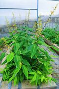 株高0.6-1米;茎基膨大。叶片长圆形或卵状披针形,长12-20厘米,宽4-5厘米,顶端尾尖,基部急尖,叶片二面的脉上疏被柔毛或无毛,无柄或具短柄;叶舌及叶鞘口具缘毛。圆锥花序顶生,长15-20厘米,苞片早落,小苞片长约2毫米;花黄色,各部均具橙色腺点;花萼管漏斗形,长4-5毫米,顶端具3齿;花冠管长约1厘米,裂片反折,长约5毫米;侧生退化雄蕊披针形,与花冠裂片等长;唇瓣倒楔形,长约7毫米,顶端2裂,反折,生于花丝基部稍上处,花丝长10-12毫米,花药长4毫米,两侧无翅状附属体。蒴果椭圆形,直径约1厘米,无疣状凸起。花期6-9月。