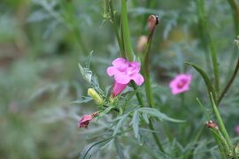 一年生至多年生草本,具分枝的茎,高达80厘米;根近木质而分枝。叶互生,不聚生于茎的基部,2-3回羽状细裂,形态多变异,长4-6厘米,小叶不规则细裂,末回裂片线状披针形,具细齿或全缘。顶生总状花序,疏散,长达20厘米;花梗长1-5毫米;小苞片绿色,线形,长3-5毫米。花萼钟状,绿色带紫红色,长和宽均约5毫米,萼齿钻状,萼齿间皱褶2浅裂。花冠淡玫瑰色或粉红色,有时带紫色,钟状漏斗形,基部收缩成细筒,长约4厘米,直径粗2.5厘米,花冠裂片圆形。雄蕊4,2强,着生于花冠筒近基部,花药成对靠合。花柱淡黄色。蒴果淡绿色,细圆柱形,顶端尾状渐尖,长3.5-5.5(-10)厘米,粗约5毫米。种子扁圆形,细小,直径约2毫米,四周具透明的膜质翅,顶端具缺刻。花期5-9月,果期10-11月。