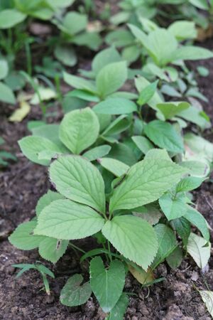 多年生草本,高20-49厘米;根状茎多节,横走,分枝,生多数细长须根,有香气;茎直立,单生或数个丛生,不分枝,下部节上对生2片鳞状叶。叶对生,通常4片生于茎顶,成假轮生,纸质,宽椭圆形或倒卵形,长8-14厘米,宽5-8厘米,顶端急尖,基部宽楔形,边缘有齿牙状锐锯齿,齿尖有一腺体,近基部或1/4以下全缘,腹面有光泽,两面无毛,侧脉6-8对,网脉明显;叶柄长8-18毫米;鳞状叶膜质,三角形或宽卵形,长4-5毫米。穗状花序单一,顶生,连总花梗长3-5厘米;苞片三角形或近半圆形;花白色;雄蕊3枚,药隔基部连合,着生于子房上部外侧;中央药隔无花药,两侧药隔各有1个1室的花药;药隔延伸成线形,长约5毫米,水平伸展或向上弯,药室在药隔的基部;子房卵形,无花柱,柱头截平。核果近球形或倒卵形,长2.5-3毫米,具长1-1.5毫米的柄,绿色。花期4-5月,果期5-7月。