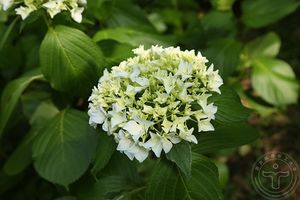 灌木,高1-4米;茎常于基部发出多数放射枝而形成一圆形灌丛;枝圆柱形,粗壮,紫灰色至淡灰色,无毛,具少数长形皮孔。叶纸质或近革质,倒卵形或阔椭圆形,长6-15厘米,宽4-11.5厘米,先端骤尖,具短尖头,基部钝圆或阔楔形,边缘于基部以上具粗齿,两面无毛或仅下面中脉两侧被稀疏卷曲短柔毛,脉腋间常具少许髯毛;侧脉6-8对,直,向上斜举或上部近边缘处微弯拱,上面平坦,下面微凸,小脉网状,两面明显;叶柄粗壮,长1-3.5厘米,无毛。伞房状聚伞花序近球形,直径8-20厘米,具短的总花梗,分枝粗壮,近等长,密被紧贴短柔毛,花密集,多数不育;不育花萼片4,阔物卵形、近圆形或阔卵形,长1.4-2.4厘米,宽1-2.4厘米,粉红色、淡蓝色或白色;孕性花极少数,具2-4毫米长的花梗;萼筒倒圆锥状,长1.5-2毫米,与花梗疏被卷曲短柔毛,萼齿卵状三角形,长约1毫米;花瓣长圆形,长3-3.5毫米;雄蕊10枚,近等长,不突出或稍突出,花药长圆形,长约1毫米;子房大半下位,花柱3,结果时长约1.5毫米,柱头稍扩大,半环状。蒴果未成熟,长陀螺状,连花柱长约4.5毫米,顶端突出部分长约1毫米,约等于蒴果长度的1/3;种子未熟。花期6-8月。
